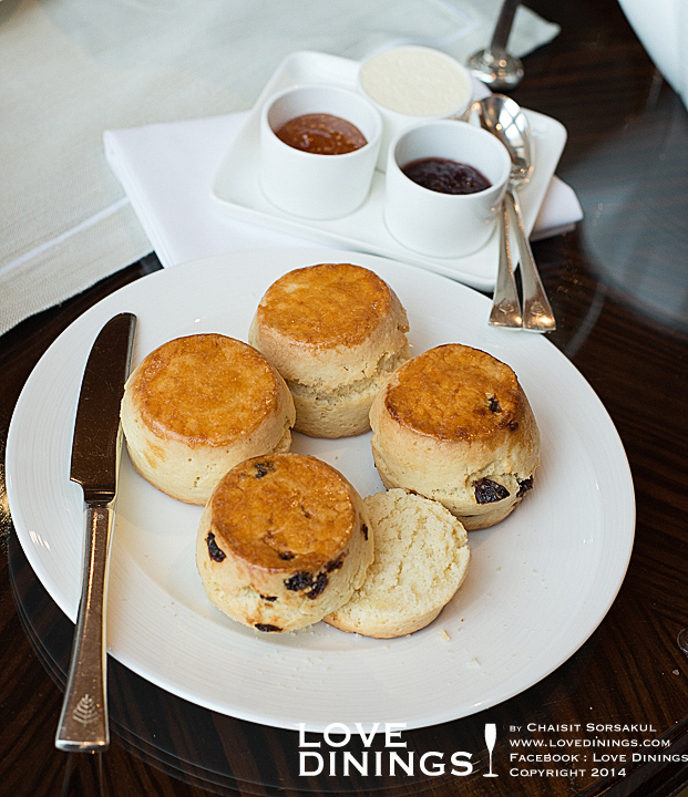 ชั้นกลางเป็นสโคน ทานคู่กับครีมและแยมผลไม้ สามารถขอครีมและแยมเพิ่มได้