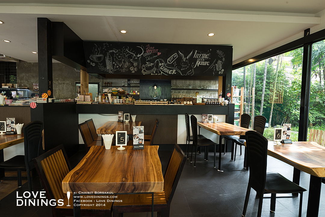 เฟอร์นิเจอร์ภายในร้านเป็นโต๊ะไม้ ผนังรอบร้านเป็นกระจกสูงสัมผัสกับ