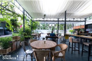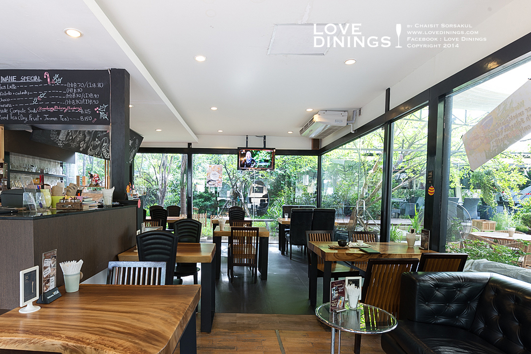 บรรยากาศของสวนสวยอันร่มรื่นย์ภายนอกร้าน ที่นั่งโซน Outdoor โอบล้อมไปด้วย