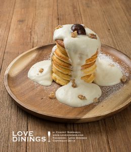 แพนเค้กเนื้อนุ่ม ราดด้วยมาการูนครีม กลิ่นหอมรสค่อนข้างหวานมาก