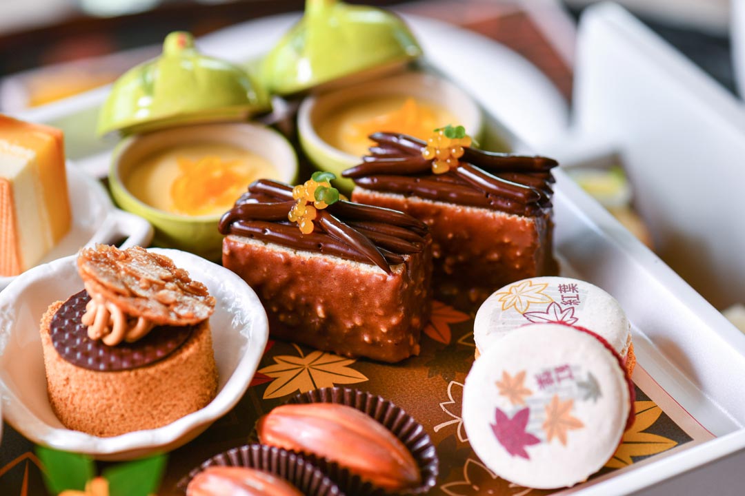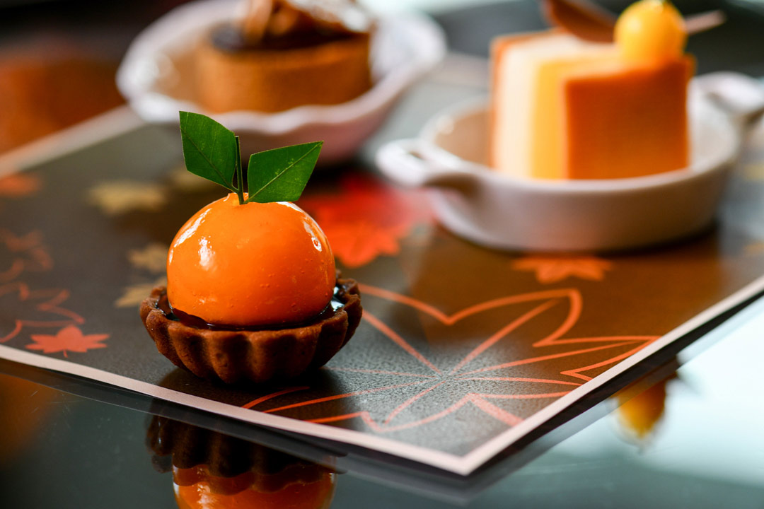 ขนมหวานน่ารับประทาน อาทิ มาการองพิมพ์ลายใบไม้เปลี่ยนสี (Koyo themed macarons) ครีมวานิลลารสยูซุ (Potted yuzu crème) แยมโรลไส้กาแฟ “อาราบิก้า” กับถั่วอัลมอนด์เคลือบน้ำตาล (Arabica almond cream roll) เค้กอัลมอนด์ไส้ช็อกโกแลตผสมส้ม (Chocolate and Orange almond cake) เค้กมะนาวและวานิลลา (Lemon and vanilla cake) ทาร์ตช็อกโกแลตผสมส้มคิงคัง (Chocolate & Kinkan tatlet) สคอนสูตรดั้งเดิมผสมเปลือกส้ม และสคอนวานิลลา รับประทานคู่กับคลอตเต็ดครีม (Clotted Cream) และแยม ส่วนของคาว ได้แก่ แซนวิชแฮมชีสเสิร์ฟกับแยมรสส้ม ขนมปังหน้าแซลมอนรมควัน เสิร์ฟกับไข่ปลาแซลมอนและต้นกระเทียม ขนมปังชิ้นพอดีคำไส้ไข่มิโมซ่า และแซนวิชขนมปังเซียบัตต้า (Ciabatta) ไส้ซอสเพสโต้ มะเขือเทศและชีสมอสซาเรลล่า แต่งหน้าด้วยมะเขือเทศตุ๋นในน้ำมะกอก