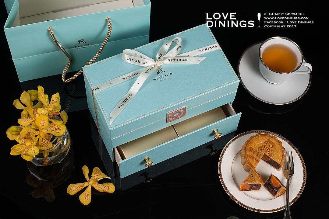 ขนมไหว้พระจันทร์ของ The St. Regis Bangkok มีทั้งขนมไหว้พระจันทร์แบบอบสูตรดั้งเดิมและสูตรใหม่มี 4 รสชาติทั้งไส้เกาลัดและแมคคาเดเมีย ไส้ทุเรียนหมอนทองไข่คู่ ไส้เต้าซาดำไข่คู่ และไส้โหงวยิ้งไข่คู่ บรรจุในกล่องหนังสไตล์เดอะเซนต์รีจิส ที่มีให้เลือกทั้งสีฟ้าสีฟ้าเทอควอยส์ และสีแดงอิมพีเรียล