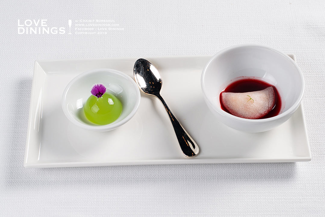 สแกลลอบจากฮอกไกโดนำไปอบ แล้วนำมา Sear จนสุก เนื้อสแกลอบจะค่อนข้างแข็งนิดนึง แต่มีรสหวาน ทานคู่กับ Porch Wine Jelly รสหวานและเค็มอ่อน ตัดรสด้วย Cinnamon Star Anise Infused Soy Milk Foam มีรสออกมันๆ เหมือนถั่วบดช่วยตัดเลี่ยนได้เป็นอย่างดี