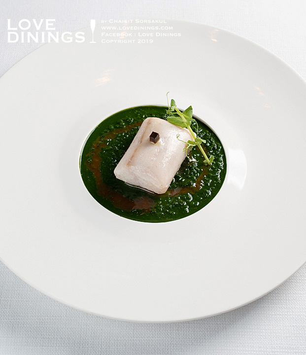 ปลาแอมเบอร์แจ๊ค นำไปทำให้สุกโดยวิธีสโลว์คุก ตัวเนื้อปลายังคงความสด ทานคู่กับซอสที่ทำจากพาร์สลีย์ (Parsley) รสออกเค็มนิดๆ ท็อปด้วยทรัฟเฟิลจากฝรั่งเศส